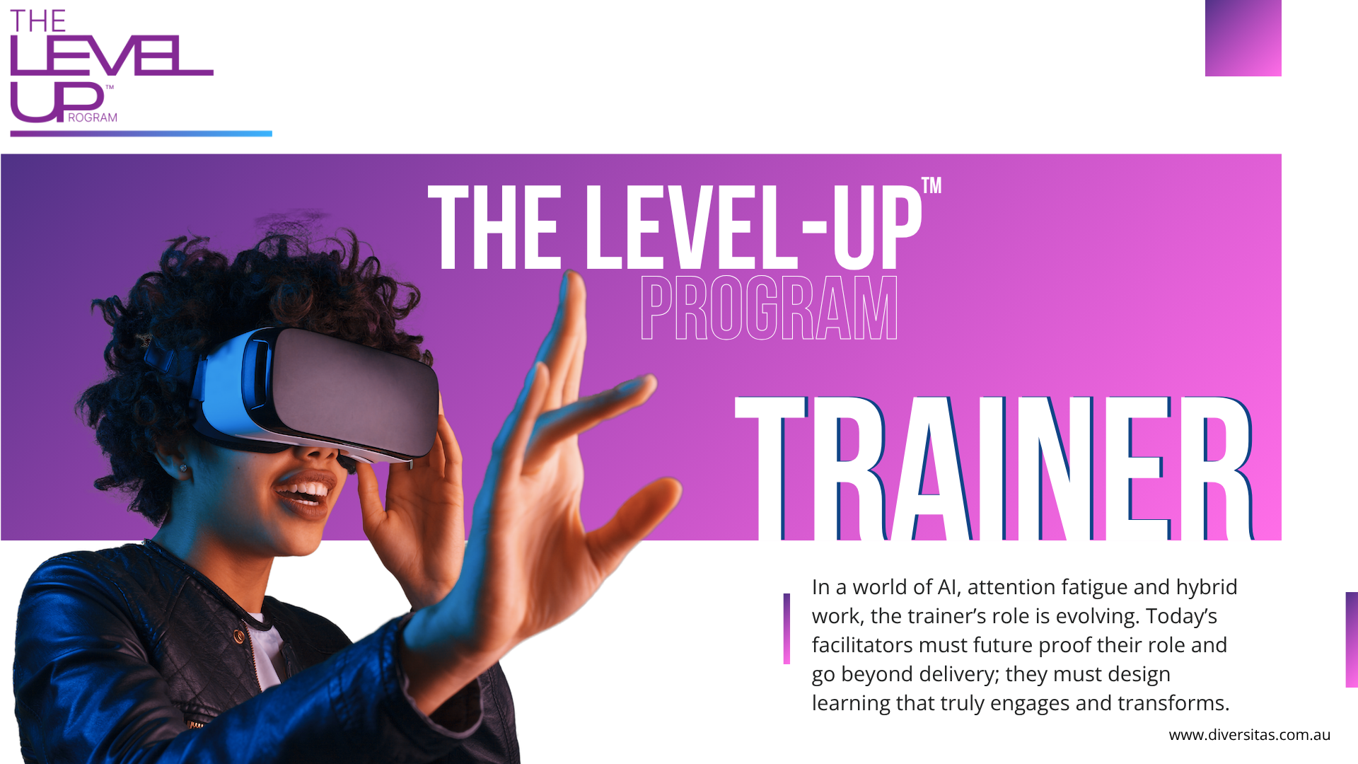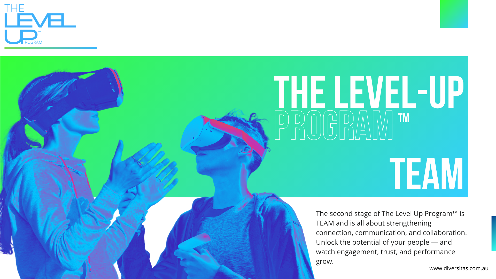 The Level Up Program™ is a contemporary learning experience designed for organisations that want to lift engagement, capability, and performance — without relying on outdated training models. We combine personality insight, immersive XR (VR/AR), applied AI, and serious play to create learning experiences that people remember, trust, and use.